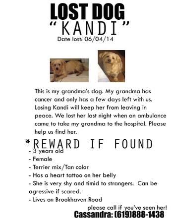 Our dog ran out of the house last night when paramedics came to take my grandmother to the hospital. She is my grandmother's dog and my grandma only has a few days left with us because of cancer. Any information would be greatly appreciated. Please contact Cassandra (619)888-1438